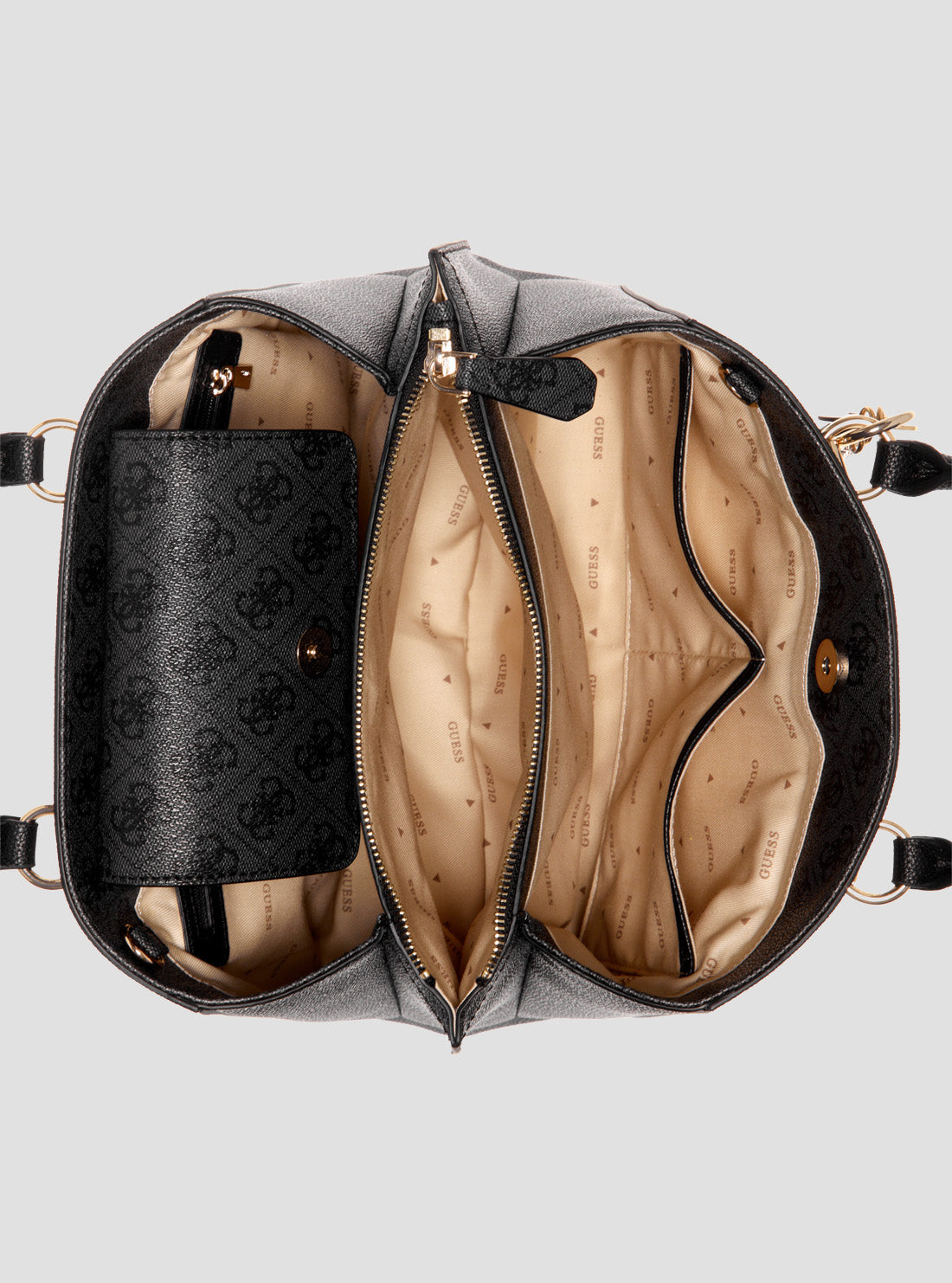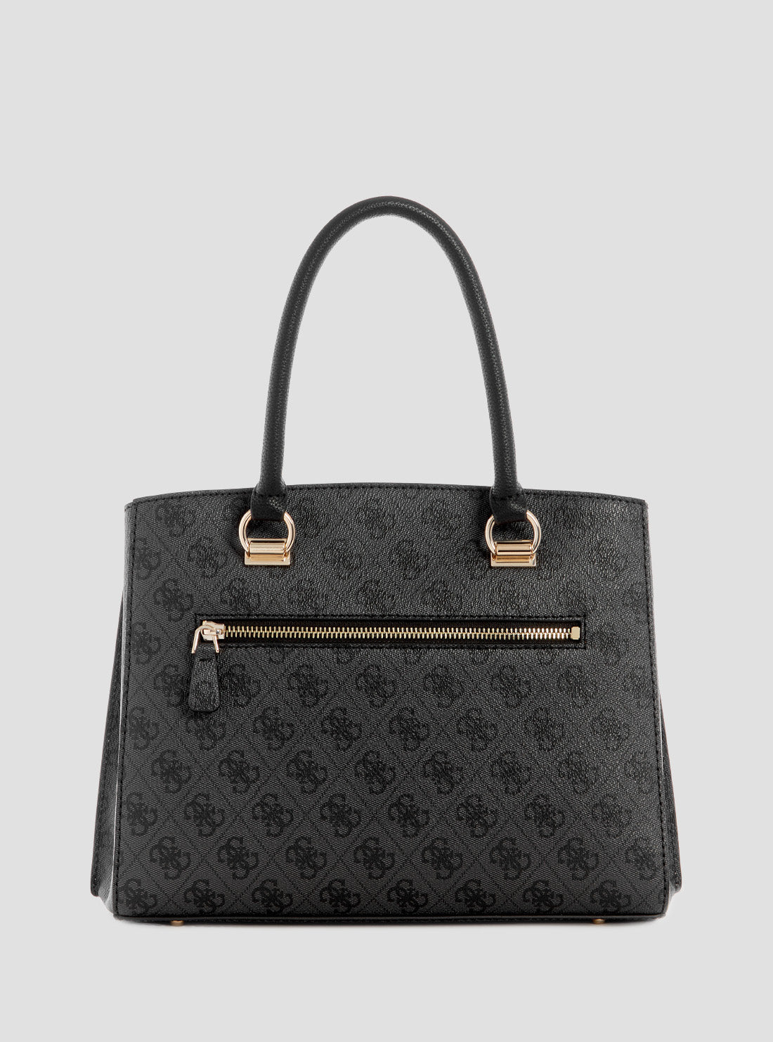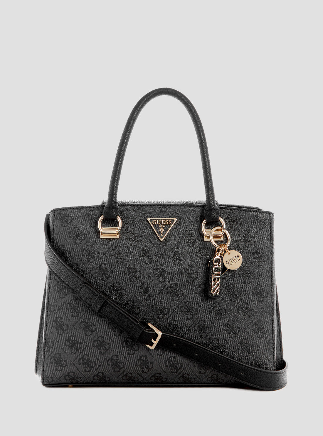 Introducing the Black Logo Noelle Girlfriend Satchel Bag! This must-have satchel pairs perfectly with any look, highlighted by a Quattro G logo print and a chic front emblem. It comes with dual top handles and a detachable crossbody strap for versatile wear. Crafted from sleek leather-look material, it features a shiny Guess logo, a magnetic snap closure, a zippered pocket at the back, and multiple inside compartments to keep your essentials organised.