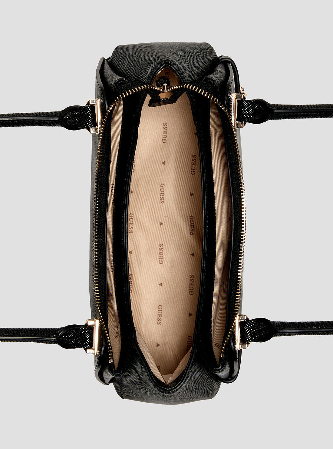 Refine your everyday look with the Black Rosalba Top Zip Shoulder Bag from GUESS. This sleek and structured silhouette features a secure zip-around closure, making it perfect for workdays, brunch outings, or casual nights out. Its compact size and elegant gold-tone hardware deliver both style and convenience. Designed with eco saffiano PU, it offers a polished finish that pairs effortlessly with any outfit.