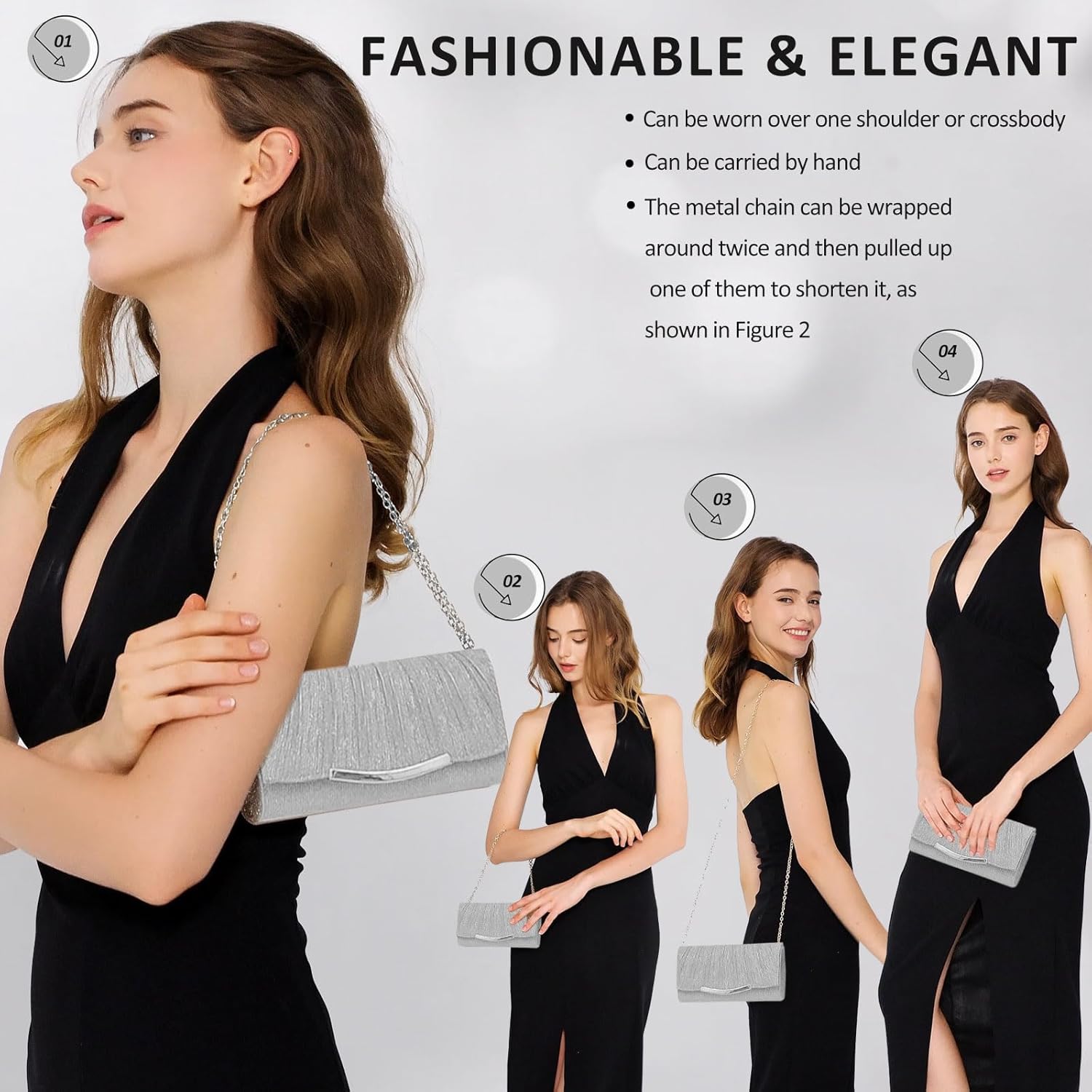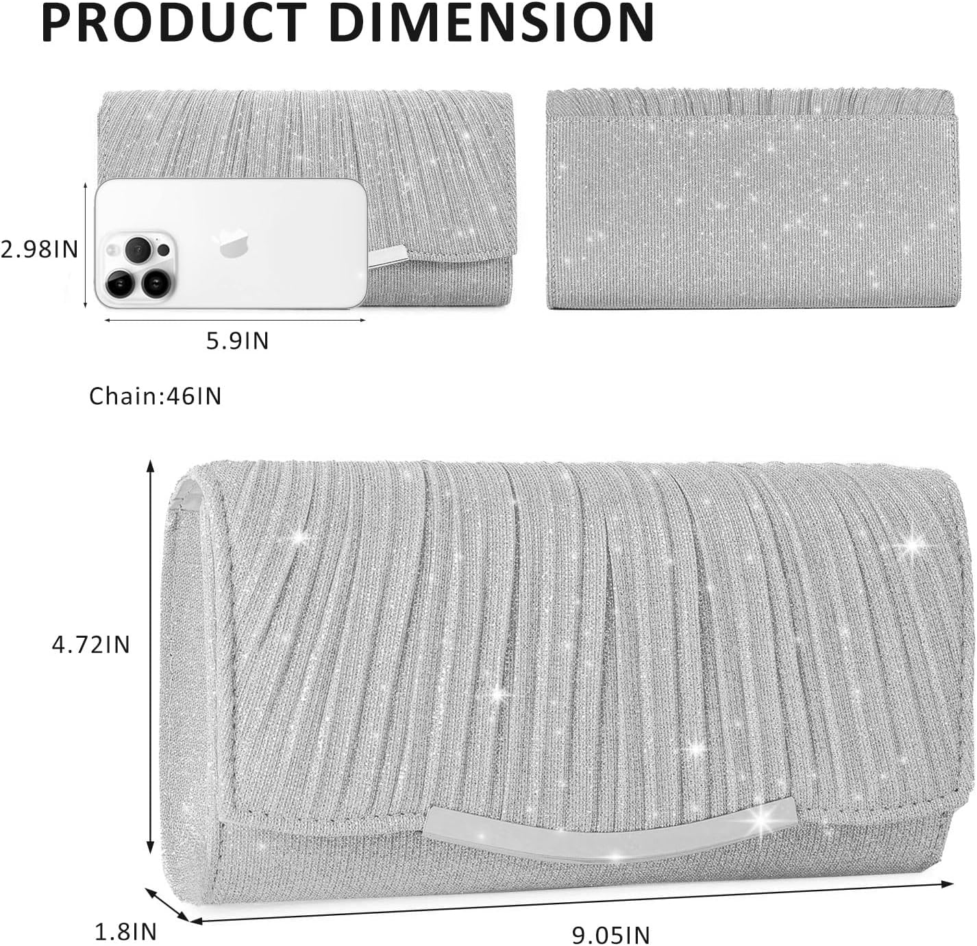- Elegant and Functional: This silver clutch purse combines style and practicality, making it a perfect evening clutch. Its elegant design ensures you look sophisticated at any formal event.The evening bag features elegant pleated detailing, adding a touch of sophistication and texture to your formal look.